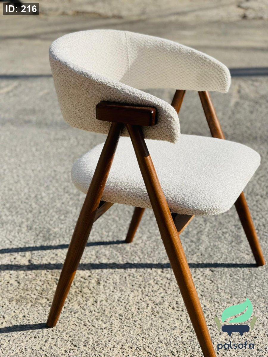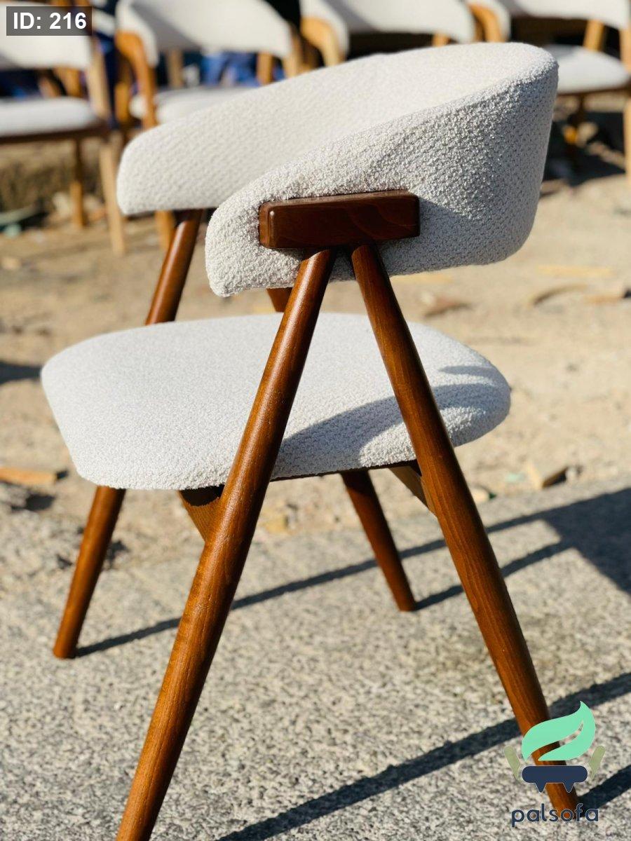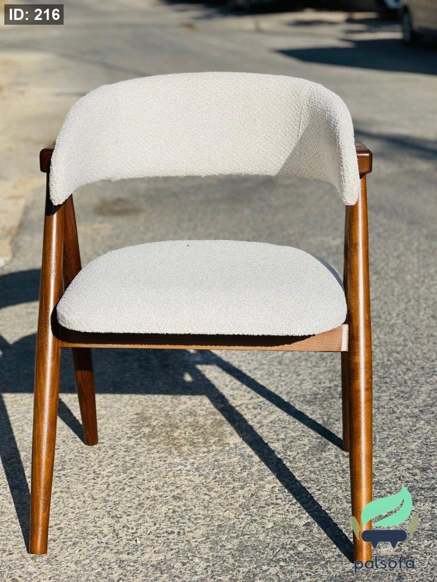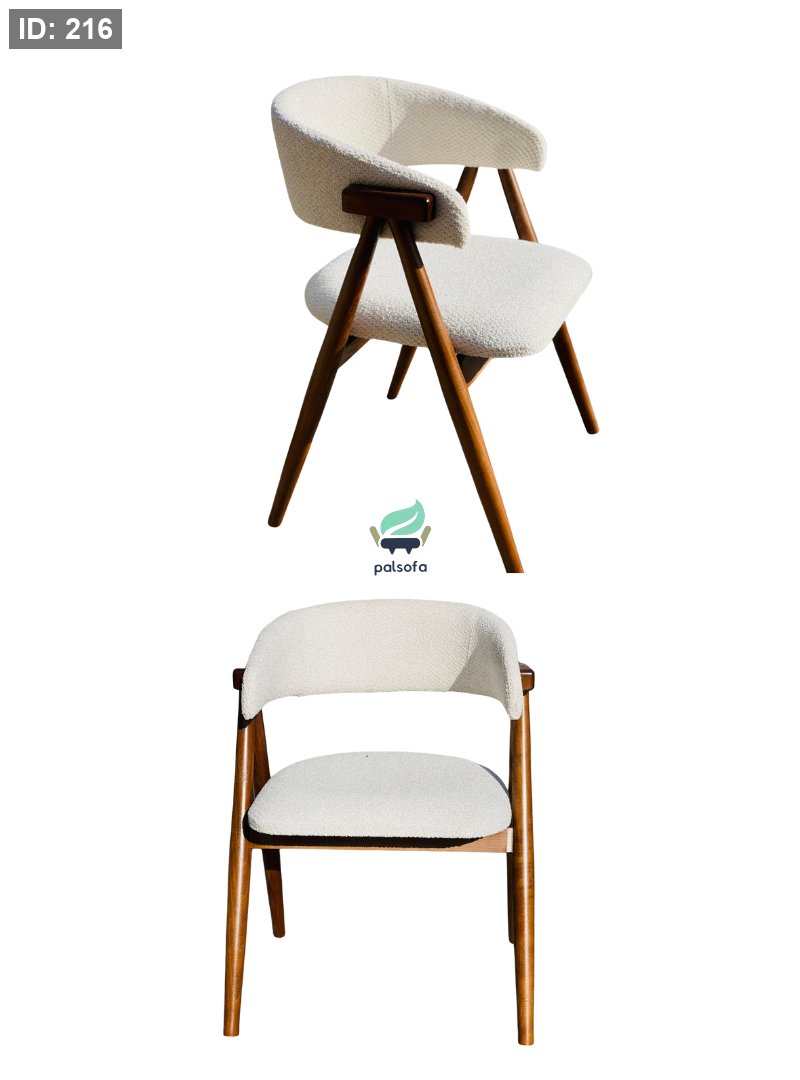כיסא QR18 מתאפיין בקווים נקיים ואלגנטיים, שילוב של שלדת עץ טבעי וריפוד בד רך בגוון בהיר.